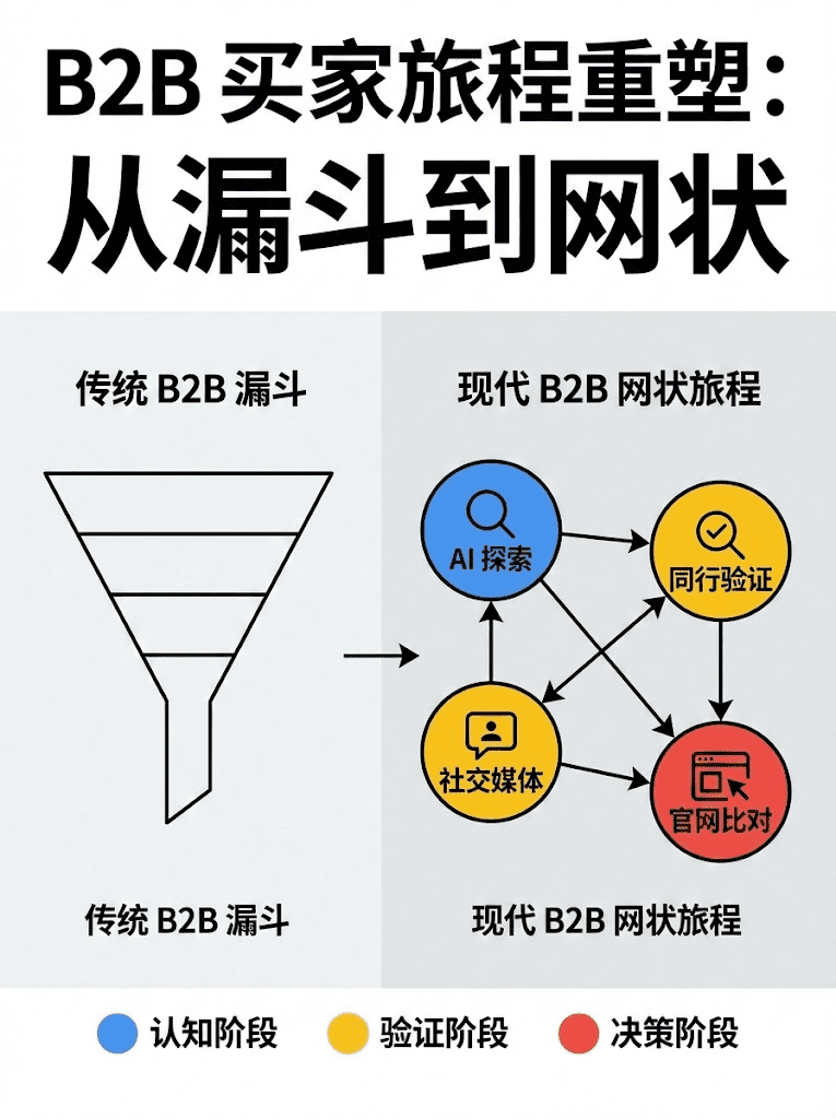 很多 B2B 独立站最大的误区是:拿着 B2C 的漏斗思维做 B2B。最新的行业数据显示,B2B 买家旅程已经从线性的“漏斗”变成了复杂的“Discovery → Validation → Alignment”网状结构。