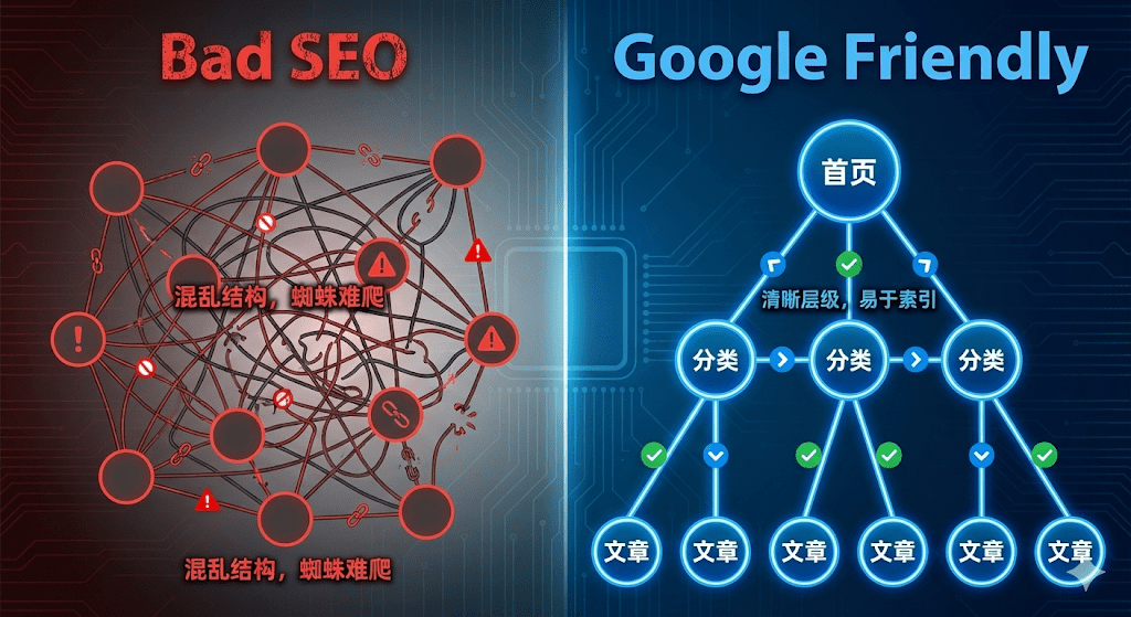 这就像你开了一家米其林水准的餐厅,但因为门口修路且没有路牌,食客根本找不到门。其实,网页结构(Site Structure)就是你网站的“路网”。如果你还在盲目地堆砌关键词、发外链,却忽略了结构优化,那你已经输在起跑线上了。